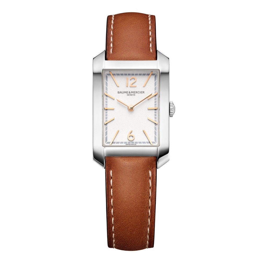A classic rectangular watch for women, this Hampton wristwatch features a pure silver-colored dial with the elegance of gilt sword-shaped hands and gilt Arabic numerals at 6 and 12 o’clock. It comes with a light brown calfskin strap with beige stitching.