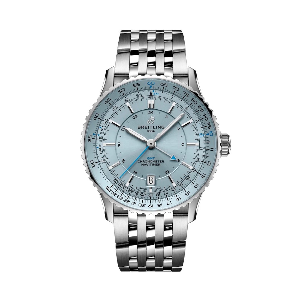• The Navitimer Automatic GMT 41 distills the iconic look, omitting the chronograph yet preserving a balanced dial composition.