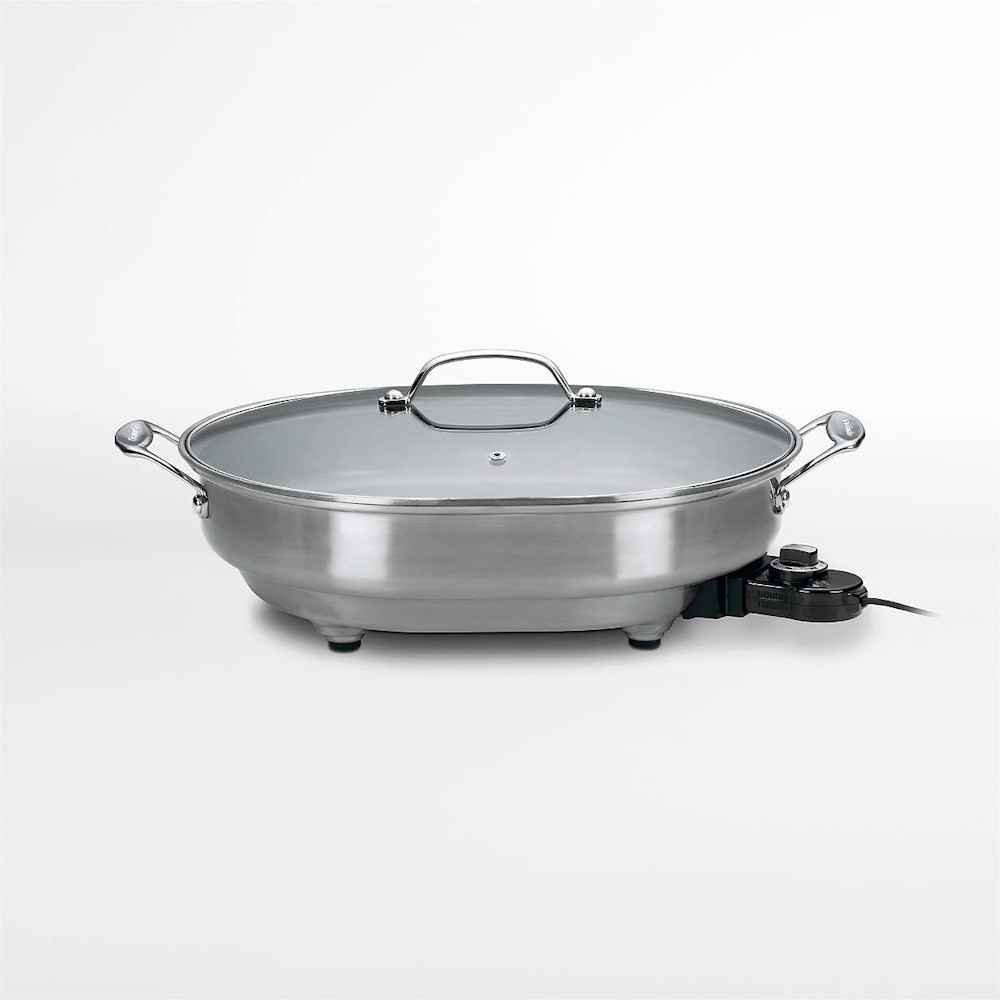 The brushed stainless steel Cuisinart Electric Skillet is one of the most versatile countertop cooking appliances on the market and a valuable addition to any kitchen. A temperature probe adjusts from Warm to 450° F and can be removed to make the Skillet dishwasher safe. The nonstick cooking surface is ideal for low-fat or no-fat cooking and is big enough for family orders of pancakes, or a fajita with friends.