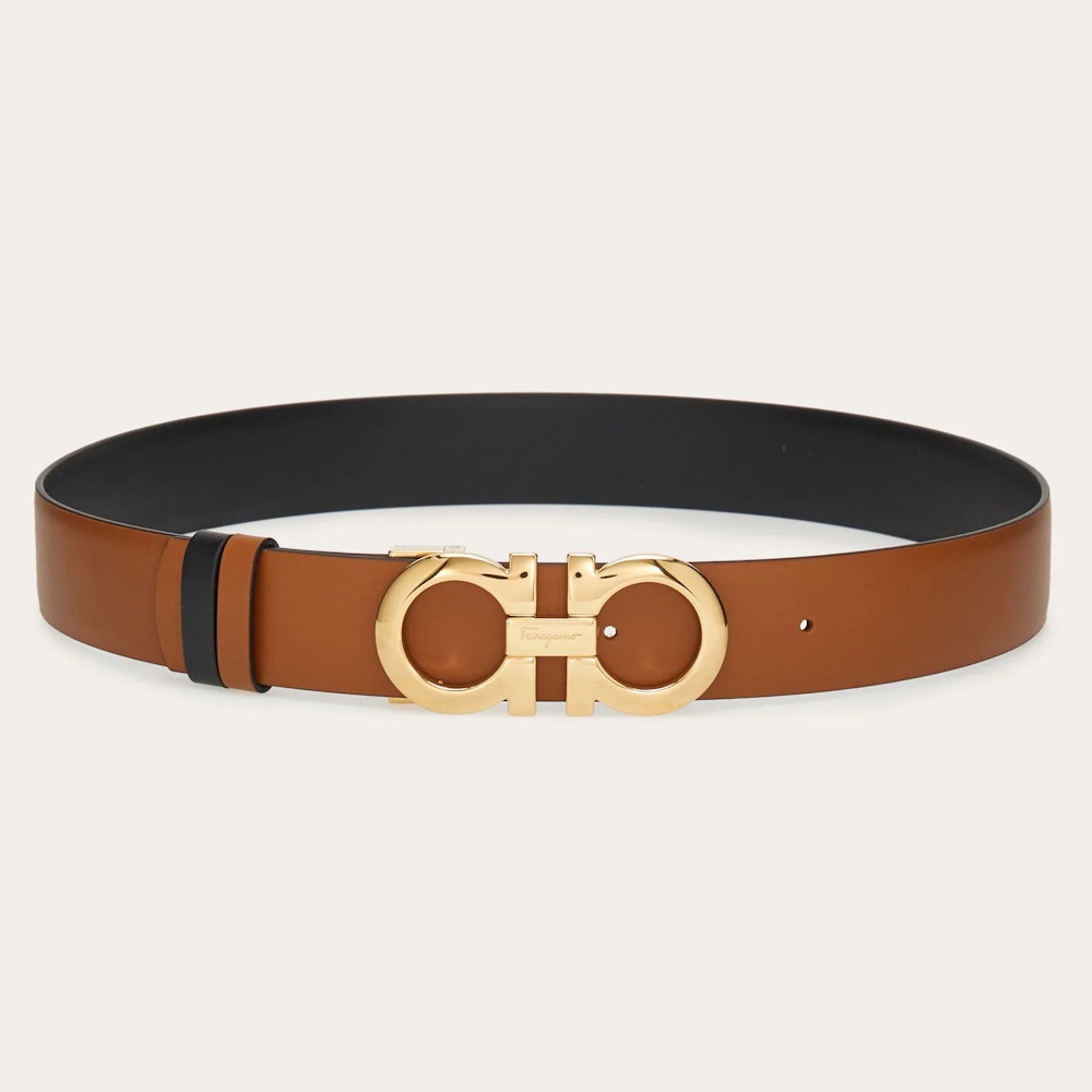 This belt is a timeless wardrobe staple. The sophisticated two-tone design is crafted from calfskin leather and adorned with the Gancini buckle. The reversible design ensures countless styling options.