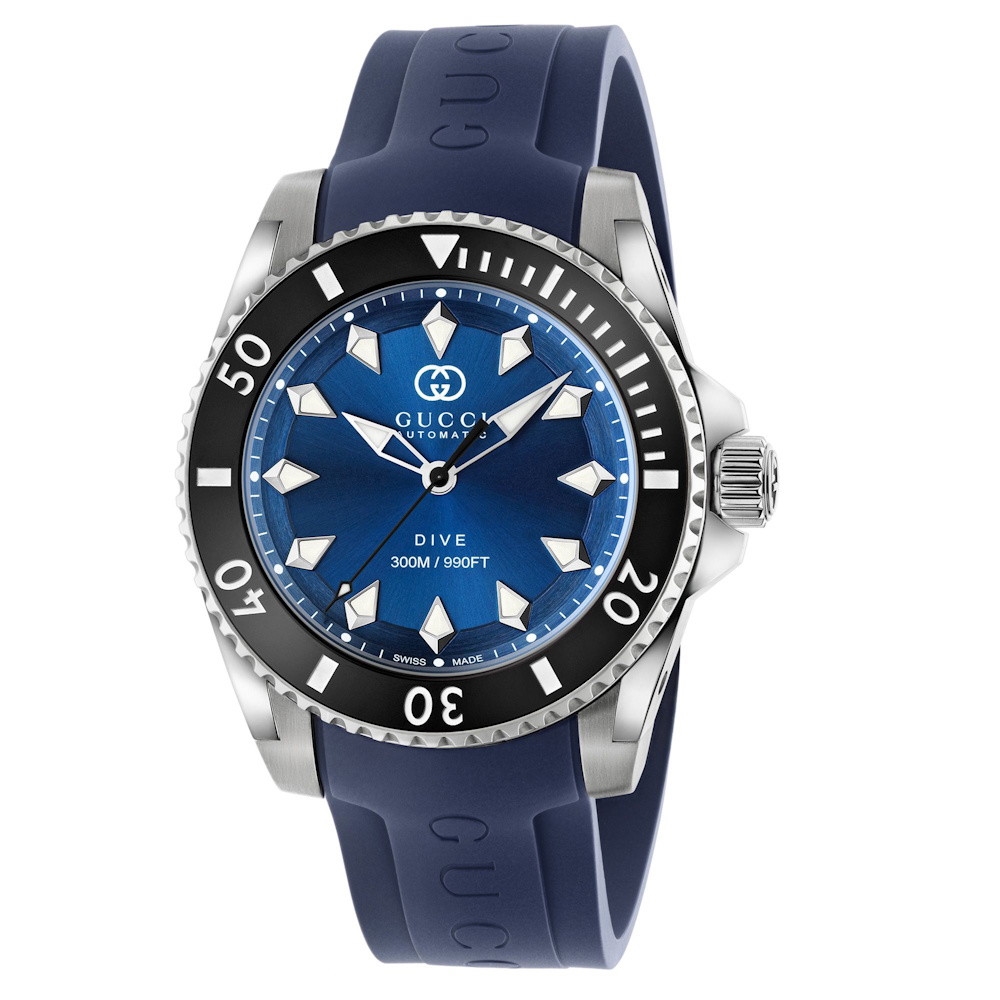 The Gucci Dive line continues to explore the House codes in contemporary ways. Designed with a steel case and a rubber bracelet, the watch is defined by the dial featuring the emblematic Interlocking G logo.