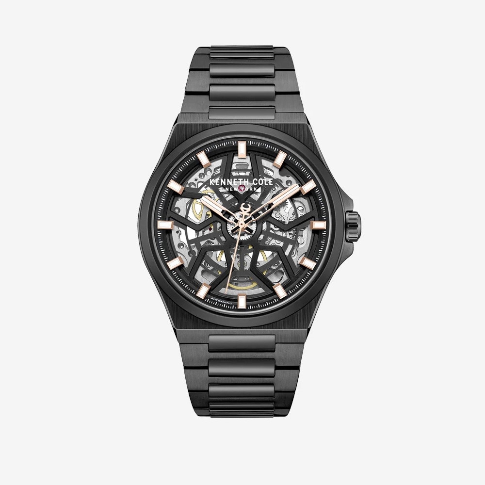 • Black skeleton dial with rose gold-tone hands and index hour markers