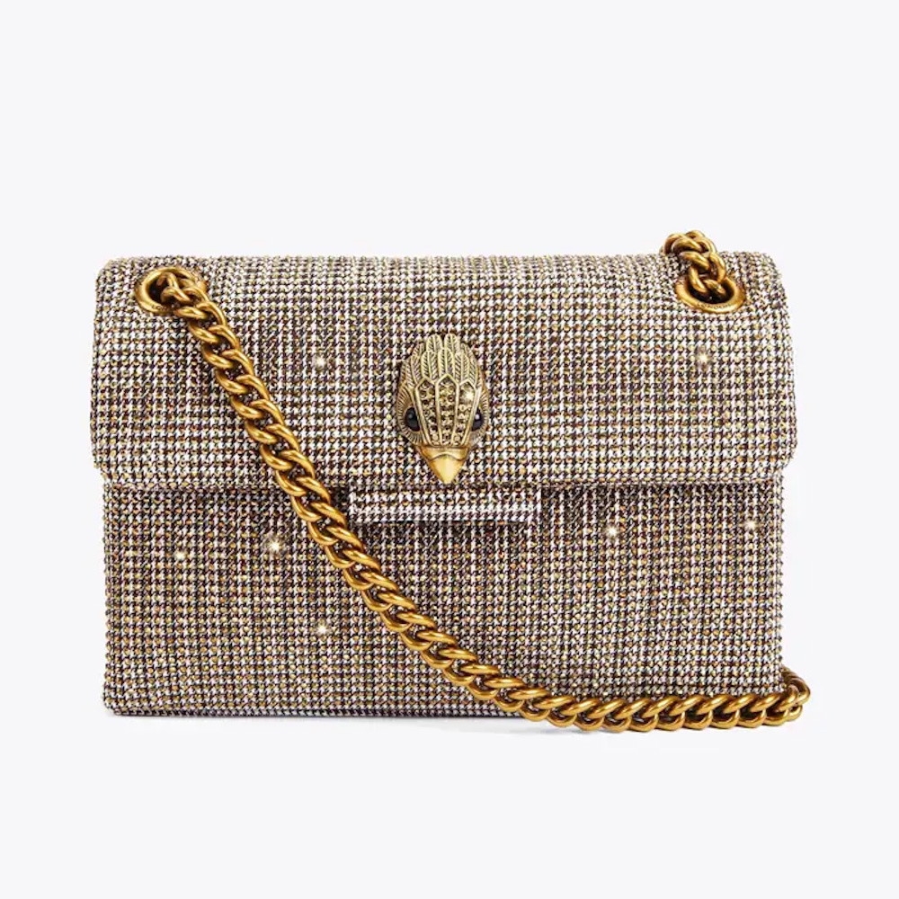The Fabric Mini Kensington is crafted from a houndstooth fabric topped with brass crystals. The antiqued brass Eagle head features crystals and black bead eyes on the front flap.