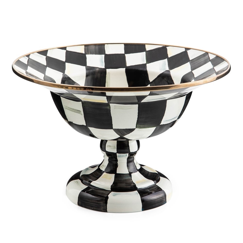 An indispensable party serving dish, the Large Courtly Check Compote is decorated with our signature hand-painted checks. It has a steel underbody and bronzed stainless-steel rim. Handwash. 5-cup capacity. Dimensions: 12" Diameter x 7-1/2" H.