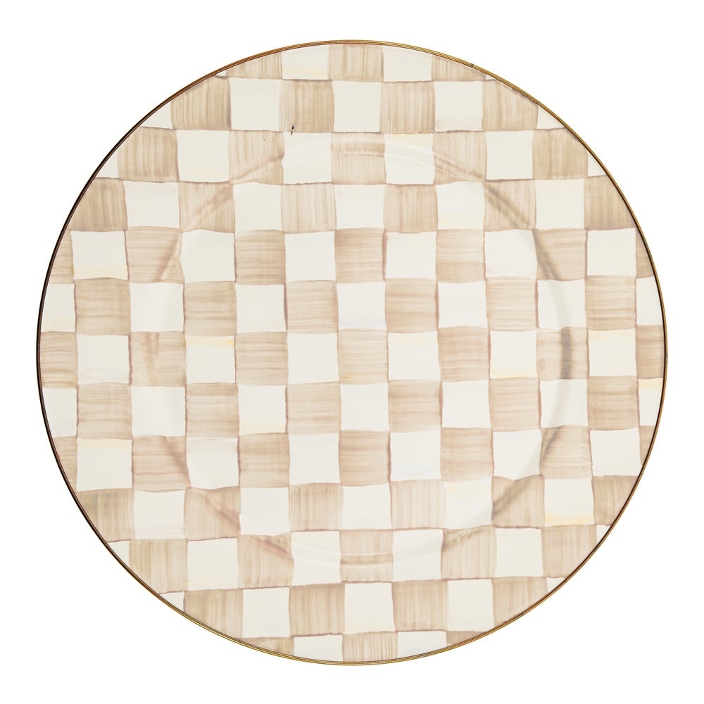 Serve your favorite dishes in style with our Mocha Check Serving Platter. The heavy-gauge steel underbody is glazed with hand-painted, coffee-colored checks and rimmed in bronzed stainless steel. Dishwasher safe. Diameter: 16".
