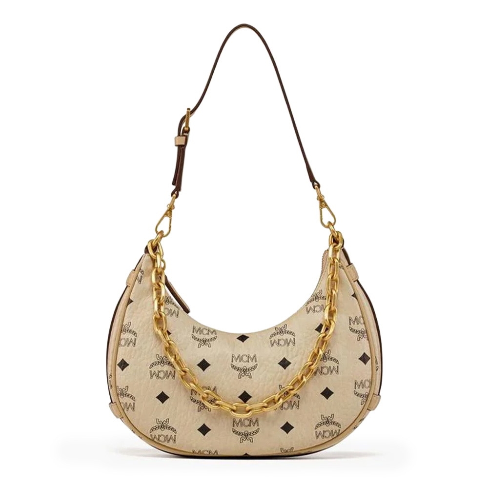 MCM Aren Small Crescent Hobo Bag in Visetos - Beige/Black