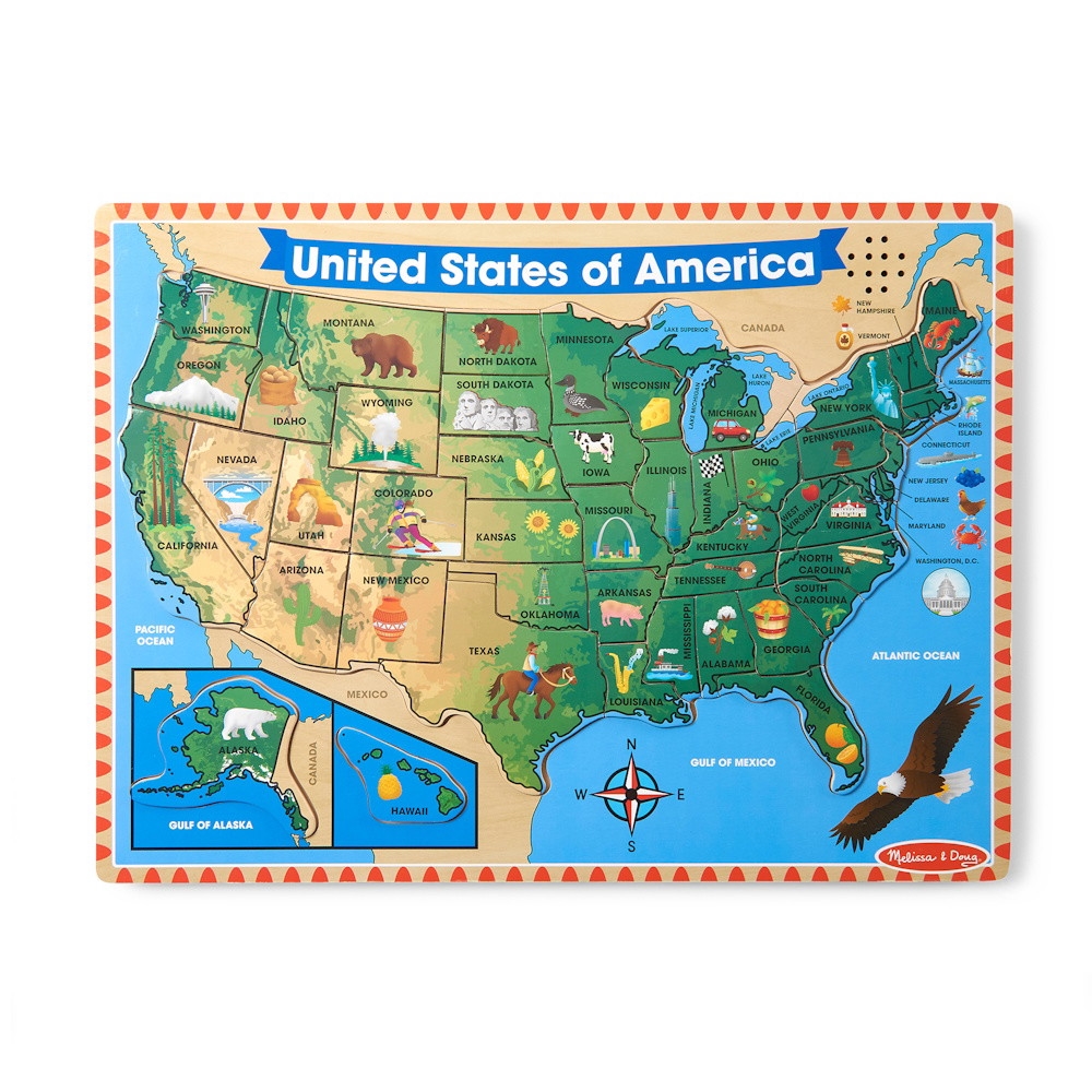 • This Melissa & Doug sound puzzle provides kids with a great introduction to the states while they practice motor skills, hand-eye coordination, and problem-solving skills.