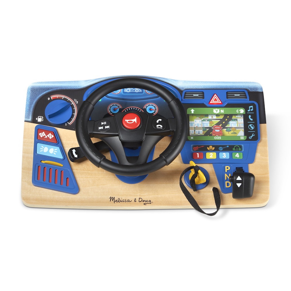 Rev up playtime and take imaginations for a spin with this realistic play steering wheel mounted on a sturdy wooden dashboard with lights, sound effects, and moving parts, including a scrolling GPS! Turn the key to start and shift into drive to get the GPS rolling-turn the wheel to keep the car on the road on the GPS display! The interactive dashboard includes ??hands-free?? buttons on the steering wheel for a phone and the radio, which plays clips of music for each of four stations. Movable parts and buttons let kids three and older beep the horn, adjust air vents, turn on signal, hazard, and headlight indicators, and rev the engine. Set a timer to count down to empty gas tank, and remove the gas cap when it?s time to fill up!