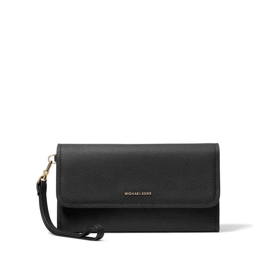Your perfect on-the-go companion. Crafted in pebbled leather, this stylish wristlet unfolds to reveal designated spots for your phone, cards, cash and ID. Detach the strap to use it as a wallet inside your everyday tote.