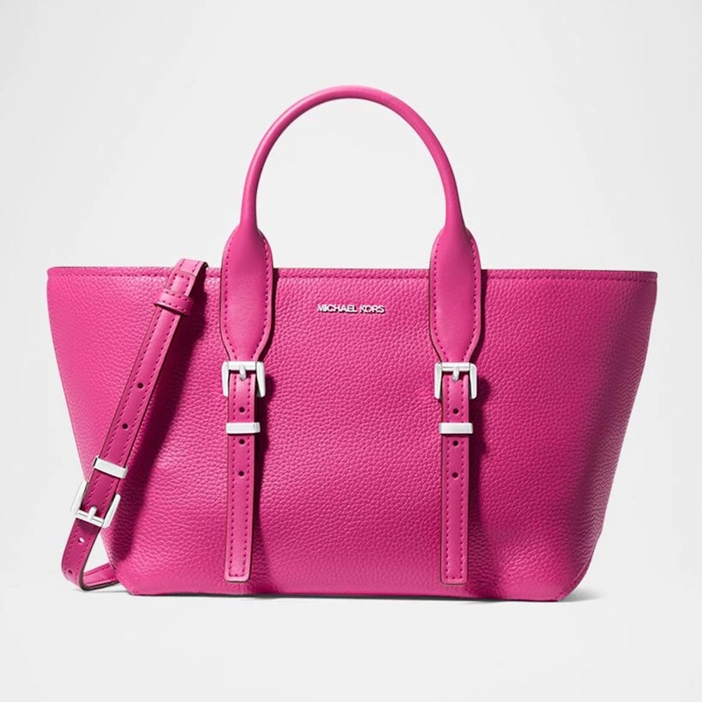 Stay organized and stylish with the Michael Kors Moore Small Satchel. This tote features dual top grab handles with chic buckle accents. Keep your belongings secure with the convenient zippered top closure. Perfect for work or weekend outings, this tote is both practical and fashionable.