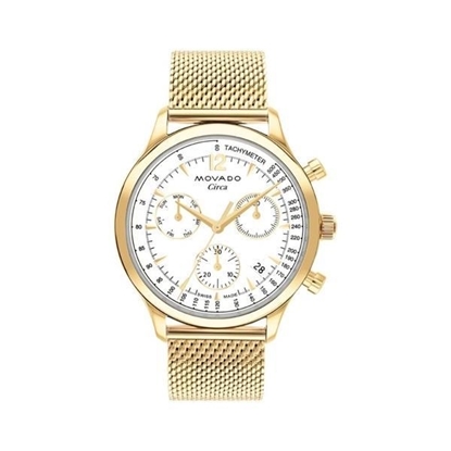 The Movado® Heritage Calendoplan Chronograph blends mid-century inspiration with modern craftsmanship. It features a 43 mm yellow gold ion-plated stainless steel case, deep blue dial with three white subdials and a cognac leather strap. Powered by Swiss quartz chronograph movement, this timepiece is water-resistant to 50 meters.