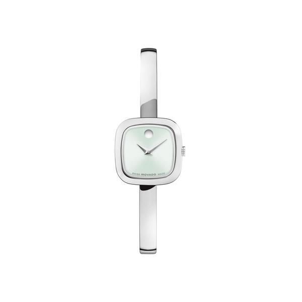 The Movado® Museum Bangle Watch combines modern minimalism with jewelry-inspired elegance. It features a 21.5 mm stainless steel case framing a light sage green sunray Museum dial with a crystal-set concave dot and steel dauphine hands, all protected by a sapphire crystal. A polished stainless steel bangle bracelet completes the design. Powered by Swiss quartz movement, this watch is water-resistant to 30 meters. Includes: Movado® Museum Bangle Watch. Dimensions: 0.85" W x 0.85" H x 7" L (bracelet length). Weight: Approx. 2 oz.