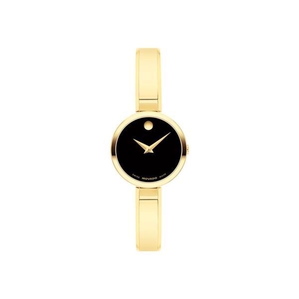 The Movado® Moda Bangle Watch combines modern minimalism with jewelry-inspired elegance. It features a 24 mm light yellow gold PVD-finished stainless steel case framing a black lacquer Museum dial with a concave dot and dauphine hands, all protected by a sapphire crystal. A matching light yellow gold PVD-finished stainless steel bangle bracelet completes the design. Powered by Swiss quartz movement, this watch is water-resistant to 30 meters. Includes: Movado® Moda Bangle Watch. Dimensions: 0.94" W x 0.94" H x 7" L (bracelet length). Weight: Approx. 2 oz.