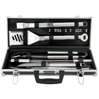 Just as an artist needs good brushes, a griller needs good tools. Set Includes: 4-in-1 spatula, fork, silicone basting brush, tongs, knife, 8 corn skewers, 4 skewers and aluminium case. Features commercial grade stainless steel with a mirror polished finish that prevents rust and corrosion.