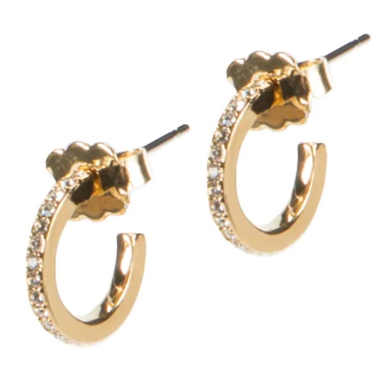 These gold hoop earrings feature pavé crystals and gold-tone metal for timeless elegance. Post back. Approximately 1/2" drop.