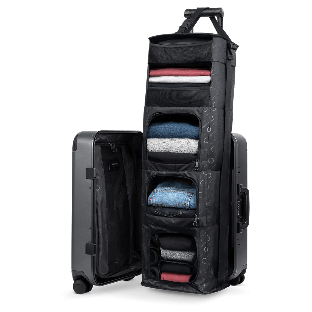 • The Carry-On Closet has a patented, five-shelf closet to keep you organized anywhere, it also acts as compression cubes to help you save space.