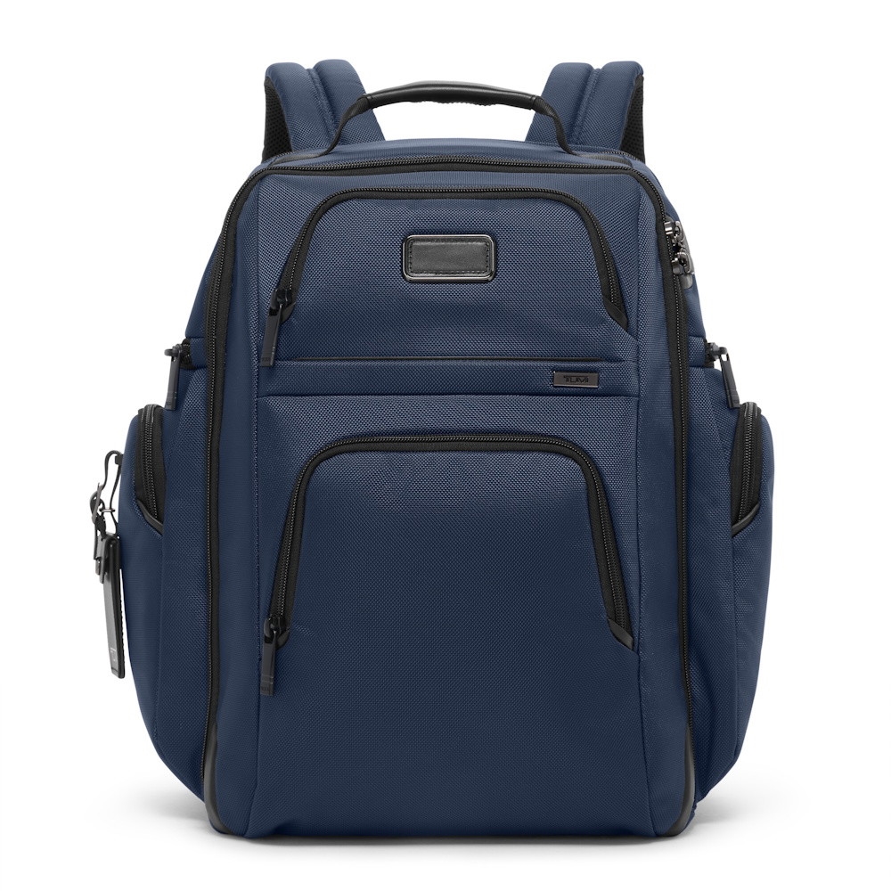 • Interior organizational open pocket, two card pockets, pen loops, two zip pockets, two elastic pockets, two media pockets, large open pocket, hidden pocket behind leather patch, padded tablet compartment, key leash, and TUMI Tracer®