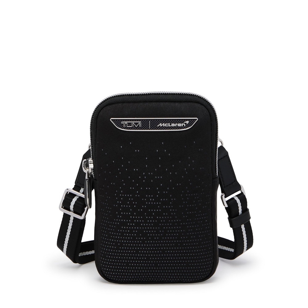 This pouch is just the right size to hold a phone and cards, while sporting a custom jacquard that echoes aerodynamic lines. Expertly crafted, the dimensional weave and deep tone effortlessly capture the spirit of McLaren.