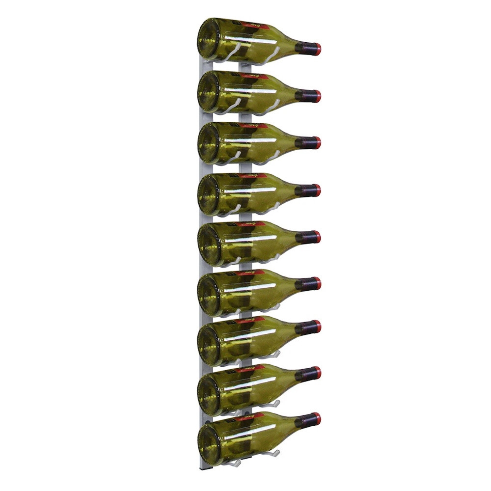 At last--a new wall-mount metal wine rack option! This 9 bottle metal rack can be fastened to almost any wall or inside of a wine cabinet. The patented design features sturdy metal construction that artfully displays your bottles with the labels visible for show. This unique wire rack consists of two identical pieces that cradle each end of the body of your bottle for a dazzling display.