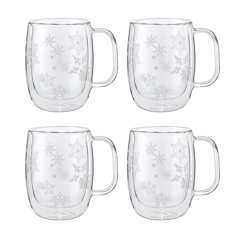 Welcome winter with these elegant holiday mugs. This set features four double wall mugs adorned with festive snowflakes. Whether you are enjoying a warming coffee, a soothing tea, or decadent hot chocolate, these mugs turn every beverage into a special holiday treat.